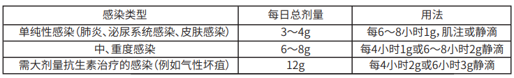 【用法用量】治療用藥:肌內注射、靜注或靜脈滴注。成人:成人常用量為1~2g/次,每6~8小時一次。劑量應根據致病菌的敏感性、感染的嚴重程度及患者的病情調整劑量(見下表)