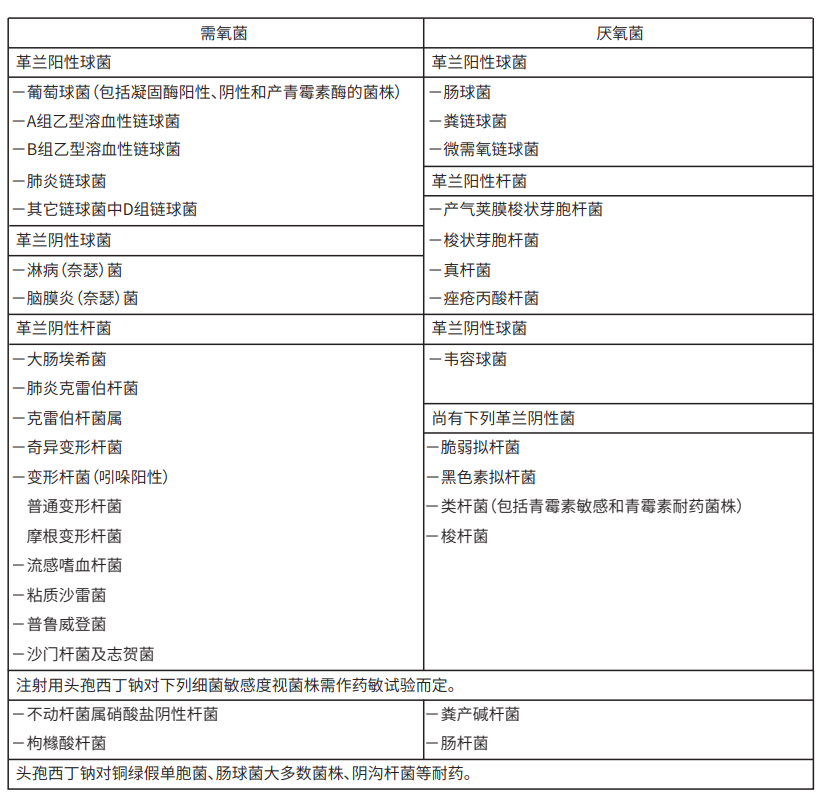 由肺炎鏈球菌、金黃色葡萄球菌(包括產青霉素酶菌株)、大腸桿菌、克雷伯菌屬和擬桿菌屬(包括脆弱擬桿菌)引起的敗血癥(包括傷寒)。