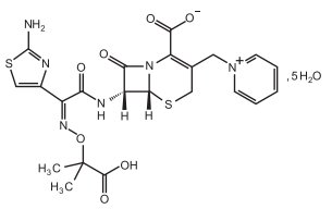化學名稱:(6R,7R)-7-[[(2-氨基-4-噻唑基)-[(1-羧基-1-甲基乙氧基)亞氨基]乙酰基]氨基]-2-羧基-8-氧代-5-硫雜-1-氮雜雙環[4.2.0]辛-2-烯-3-甲基吡啶鎓內鹽五水合物