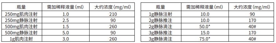 250mg肌肉或靜脈注射,500mg肌肉或靜脈注射,1g肌肉或靜脈注射,2g或3g靜脈推注: