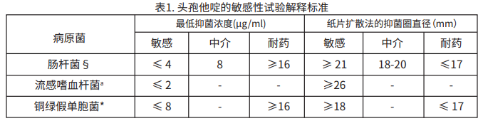 稀釋法 采用定量方法測定最小抑菌濃度(MIC),這些MIC值可用于評估細菌對抗菌藥物的敏感程度。應采用標準測試方法來測定MIC,可根據表1中的標準對測定的MIC值進行解釋。