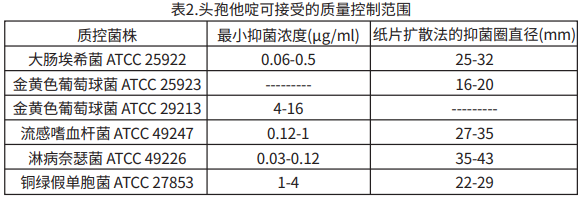 質量控制 標準化藥敏試驗方法需采用實驗室對照品,以便監測和確保藥敏試驗中所用樣品和試劑以及試驗操作人員技術的準確度和精確度。頭孢他啶標準粉末應提供表2中的MIC值范圍。對于使用30μg頭孢他啶紙片進行的擴散法,應符合表2中的標準。