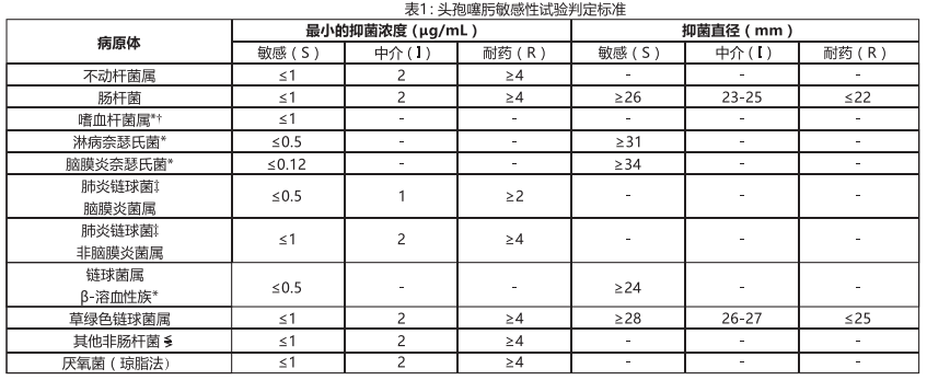 采用定量方法測定最小抑菌濃度(MICs),這些最小抑菌濃度值可用于評估細(xì)菌對抗菌藥物的敏感程度。應(yīng)采用標(biāo)準(zhǔn)測試方法(肉湯法或瓊脂法)來測定MICs,可根據(jù)表1中的標(biāo)準(zhǔn)對測定的MICs值進(jìn)行解釋.