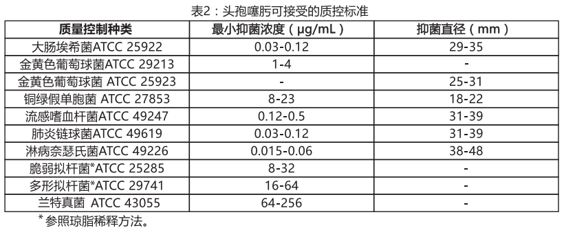 標(biāo)準(zhǔn)化藥敏試驗(yàn)過程要求利用實(shí)驗(yàn)室監(jiān)控并確保測定過程中供試品和分析試劑的準(zhǔn)確度和精密度,以及個(gè)人操作實(shí)驗(yàn)的技術(shù)水平.應(yīng)提供具有表2中MIC值的頭孢噻肟粉末標(biāo)準(zhǔn)品.對于使用擴(kuò)散法的30pg的頭孢噻肟紙片的抑菌直徑標(biāo)準(zhǔn)應(yīng)該符合表2的數(shù)值.